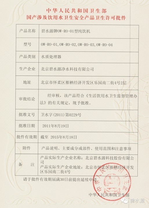 【净水知识】水批是什么?为什么我要买有水批的净水机?【小编语】目前,净水行业还不够成熟,存在一些不规范现象,如:没有卫生批件的净水器进入市场销售,多款产品套用一个卫生批件生产销售等。引发的种种质量、售后问题,使得很多想进入净水行业的人心存芥蒂、望而却步,消费者使用满意度不高。大大阻碍了净水行业的健康发展。所以小编建议朋友们无论你是要选择净水器品牌加盟,还是选购一款家用净水器,一定要查询该品牌是否有卫生部颁发的卫生批件,是否有完善的售后服务体系和核心技术,谨慎选择。