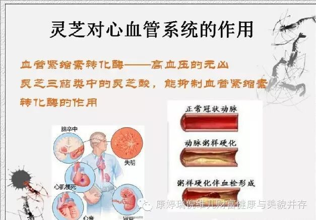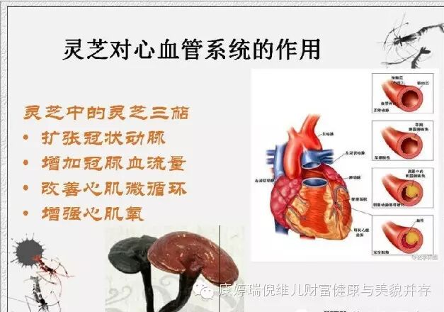 灵芝三萜(灵芝酸)可有效地扩张冠状动脉,增加冠脉血流量,改善心肌微循环,增强心肌氧给养,因此,对心肌缺血具有保护作用,可广泛用于冠心病、心绞痛等的治疗和预防。灵芝中的三萜类还能有效降低血液中的胆固醇、甘油三酯和血液中脂肪的含量,进而防止血液凝结,同时防止动脉粥样硬化,脑栓塞。