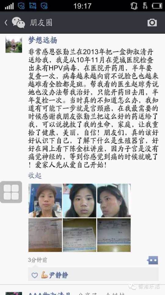 1.我是来自山东青岛的姜卫萍,今年44岁,我结婚两年以后患上了比较严重的妇科病:宫颈糜烂三度,霉菌性阴道炎和盆腔积液,这些妇科炎症困扰我很多年,真是苦不堪言,整天往医院的妇产科跑,花了大把的钱买回一大堆治标不治本的药,最后彻底失望不再相信医院,每个月遭受着难以启齿的折磨。在2013年8月份的一天,朋友介绍给我御淑清丹,一开始我真的不相信,因为我觉得医学这么发达的今天,连医院都解决不了的病症,一粒小小的保健品药丸似乎显得更加微不足道,在朋友的耐心解说之后,觉得给朋友个面子勉强买了一盒,结果用了4粒之后,我原来晦暗发青的脸有了明显变化,脸色开始红润有光泽,而且拿出清丹排出了很多豆腐渣样的污物,用到第7粒时,排出一个囊肿(我因为不相信医院十几年没做过妇科检查,是经过咨询专业老师认定是囊肿),因为用清丹后由子宫往外排毒素刺激外阴奇痒难忍,而且这时又往外排积液,我是又痒又疼象灼烧一样,又象抹了辣椒水,这时我对照69种好转反应,我心里坚信这个药丸的神奇功效,所以我一刻不停继续用药丸(那时还没有御淑伴侣),我一直坚信坚持用……现在用了6盒左右,我所有的疾病全部好了,用到不到一盒我就加入乐活这个乐善好施的爱心的团队,将我的感恩之心倾注在这个小药丸上,将爱心播撒到所有在痛苦折磨中的姐妹们家中,让她们走出痛苦的阴霾是我是乐活人最大的心愿!!