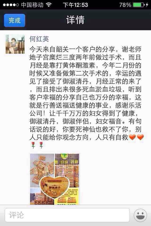 自我用心经营乐活事业一年之久以来,走遍中国各省地区,服务了无数的案例,见证无数的奇迹,这一幕幕时刻感动着我,我们是那么的普通那么的平凡,能经营乐活事业是我们的福气,我们没有任何的医学知识及水平,却借助神奇丹丸的力量解决了重多医院医生无法解决的妇科疑难杂症,我想与家人分享的是……