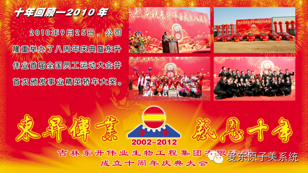 十年十大成就,但十岁的东升,在人生的岁月中我们还处于少年的依赖期,需要政府和社会的继续理解、支持与帮助,需要大家的呵护与关爱,先求生存、后图发展,经历了步履蹒跚,学会了加速奔跑,必将会有血气方刚、风华正茂的朝阳期,请大家拭目以待,我们的明天一定会更好!