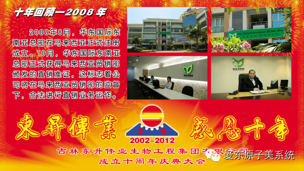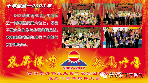 十年来,我们采用了直销行业独具一格的专业系统和文化;采用极具特色的教育培训体系和先进、创新、人性化的消费回赠计划,使广大客户与经销商既是产品的消费者,又成为利润的最大分享者。团结创业、共同富裕,一起迎来了东升伟业又一次辉煌!