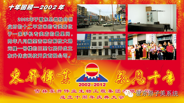 金秋十月是收获的季节,成熟的季节。在十八大胜利召开的前夕,在响应市委市政府“三年看吉林,实现新跨越”大讨论活动推动下,今天我们怀着无比喜悦和激动的心情,迎来了东升伟业成立十周年庆典。十年来,在各级领导、各界朋友的大力支持和全体员工的共同努力下,东升伟业由小到大,由弱到强,从一个默默无闻、蹒跚学步的孩子发展成同行业中极具影响力的企业,这是我们共同努力的结果,也是对全体东升人辛勤付出的最好回报!
