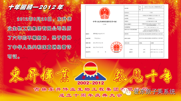 忆往昔,峥嵘岁月,十年的心酸、艰难、曲折,十年的坚持、奋斗、打拼!在行业跌宕起伏、风云变幻的十个春夏秋冬中,经过苦水、汗水、泪水的浸染,历经风雨磨砺,我们始终坚持,永不放弃!三次申牌,六载努力,东升伟业终于2012年8月28日获得国家商务部颁发的直销经营牌照!