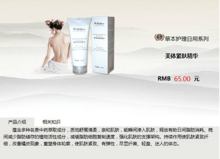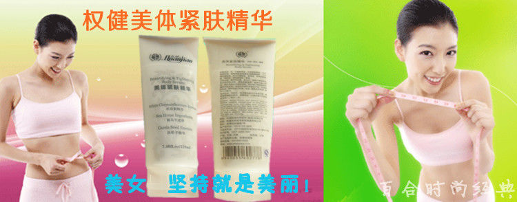 产品功效特点:多种植物成分渗透至皮肤深层,促进身体血液及淋巴系统循环,帮助体内脂肪细胞的分解与排泄,并帮助排除体内多余水分,使体型苗条,曲线玲珑有致,让您的身材妖娆多姿,楚楚动人,风光无限。