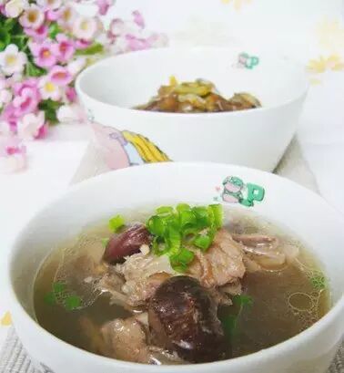 (3)水煮滚,放入全部材料,大火煮十分钟,转文火煮二各半小时,加入盐或鲜味露调味即可食用。