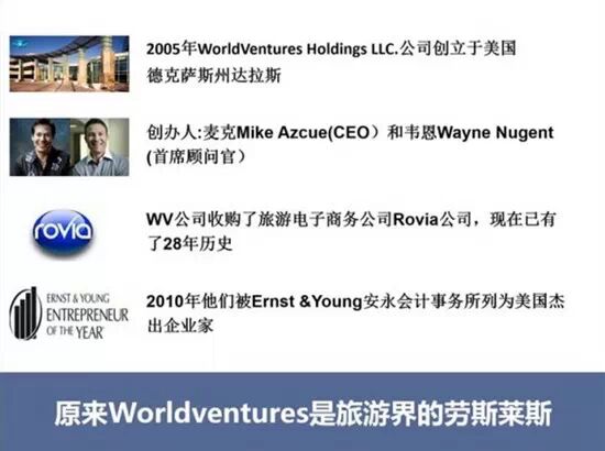 Worldventures公司,是世界上唯一一家以旅游产品做直销的公司,产品新颖,价格低廉。