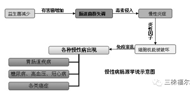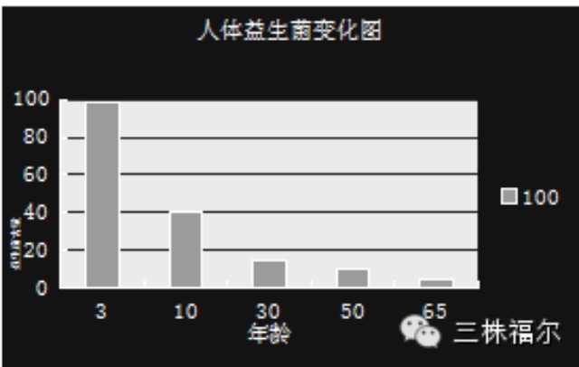 但是,随着年龄的增长及各种因素对胃肠的影响,人体益生菌数量会不断减少。人在婴幼儿时期肠道内的益生菌占细菌总量的百分比可高达98%,青少年时期减少到40%左右,中年时期降为10%—15%,65岁之后就不到5%了。益生菌数量太少就不能抑制有害菌的生长,就会引起肠道菌群失衡,进而引起各种慢性炎症,这种低度的、全身性炎症产生炎性因子,炎性因子随着血液流动影响人全身的细胞,会使人出现萎靡不振以及种种不适症状。长期、低度的炎症,就可以破坏人的细胞的很多机能,例如使胰岛素受体失活就会出现糖尿病,或者血管壁受损,开始堆积胆固醇,就会出现血栓。在慢性炎症的打击下,各种慢性病就会出现。这就是上海交通大学生命科学院赵立平教授提出的慢性病的肠源学说。