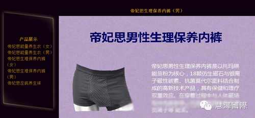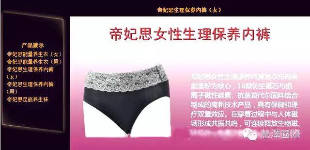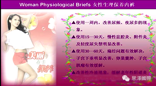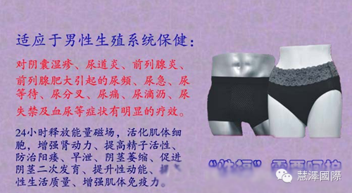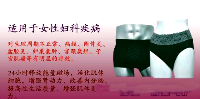 B:帝妃思功能性男女内裤。设计有18颗900高期生物磁。磁力线有效深入皮下组织4CM深度。扩张血管。清除血液垃圾。提高细胞的含氧量。结合负离子与远红外作用。穿着一个月。盆腔炎症状明显改善。