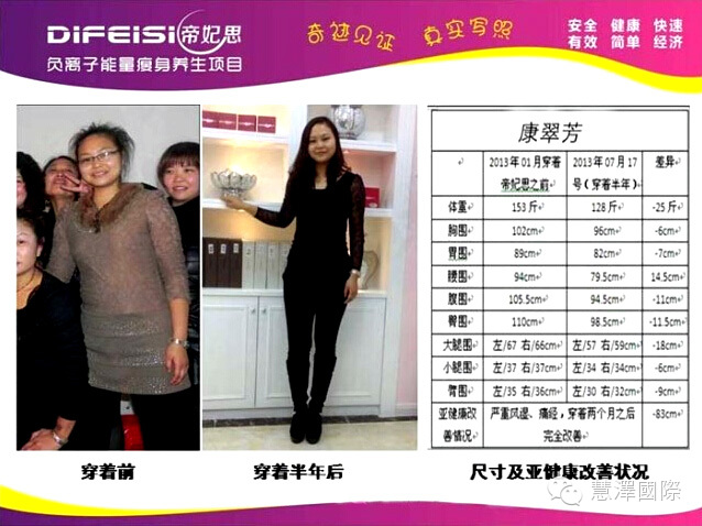 帝妃思能量养生衣是中国市场目前唯一一款对人体起着双向调节作用的塑身衣,肠胃差、特别消瘦的人群穿着1-2个月,肠胃消化、吸收功能和气血循环改善,人变得气色好、体形圆润;而产品对肥胖人群则起着排毒减肥的功效。