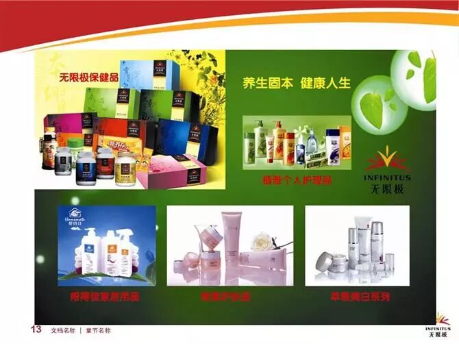 无限极(中国)研发生产出5大系列,6大品牌,80多款产品,包括:无限极健康食品、维雅护肤品、萃雅护肤品、植雅个人护理品、帮得佳家居用品、享优乐养生用品。