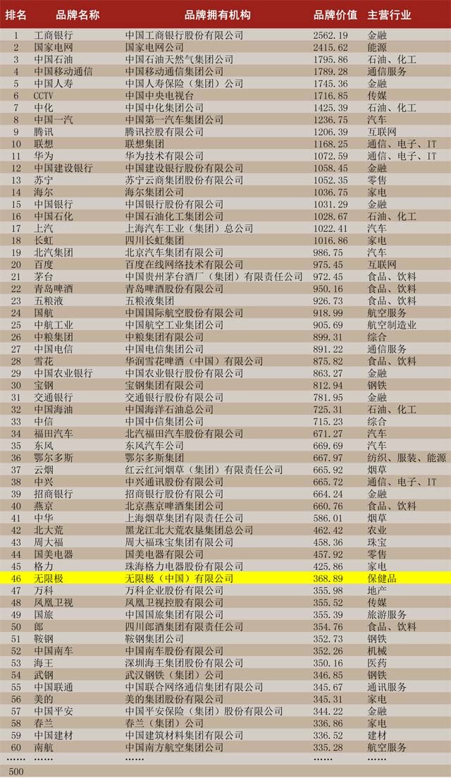 6月 25日,第十一届世界品牌大会暨2014年中国500最具价值品牌发布会在京召开,会上,国际权威品牌评审机构——世界品牌实验室(World Brand Lab)发布2014年《中国500最具价值品牌》排行榜。在本届榜单中,无限极排名第46位,品牌价值368.89亿元人民币。