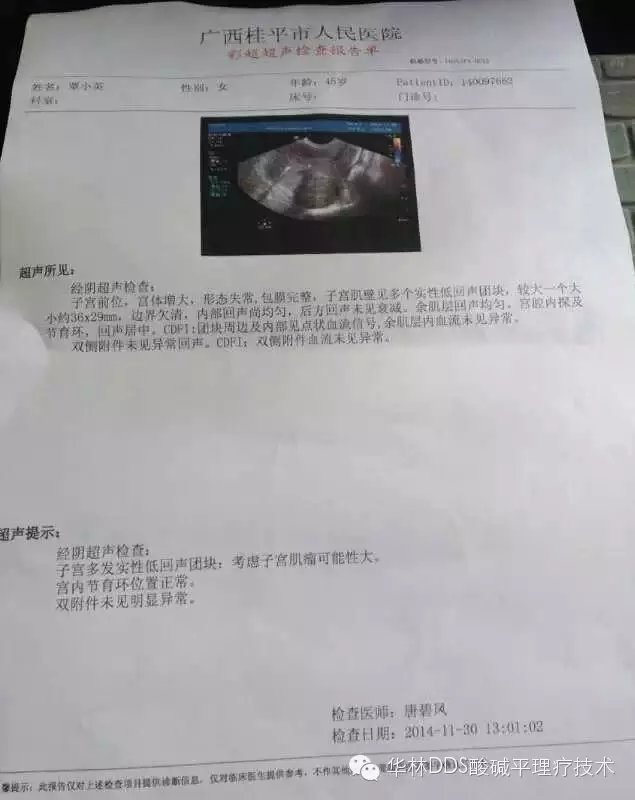 以上的检查结果好转,增加了她的信心,接着她坚持了5个疗程的调理,2014年11月30日再去医院检查,很到了以下数据: 乳腺增生和子宫肌瘤都没了。