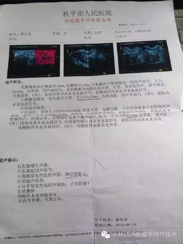酸碱平案例分享 像这样的技术不知道到底能值多少钱······ 酸碱平DDS生物电理疗!瞬间疏通经络,激活细胞! 我不是医生,但是我带电的一双手可以把你身上的疾病痛苦解除掉;我不是医学教授、博士,但我学会了传统中医和现代高科技完美结合的,最简单管用的生物电渗吸推拿技术这一高端养生绝技!!!我开的不是医院,但是有很多亚健康、颈肩腰腿疼、乳腺、前列腺病等许多患者从我这里重新获得了健康!我不是老师,但是我把这个技术传授给了天下爱好养生保健的患者、朋友! 我没有太大的抱负,只希望全民皆医,人类生命自然健康,脱离抗生素、激素给人类生命带来的危害损伤,花最少的钱解决最大的问题!如果您能理解接受,我希望您来了解考察!!让自己不但成为家庭的理疗保健师!更可以为别人送去健康,为人类的生命健康服务,并可给家人带来一份可观的吉财与健康。 1.覃小英女,45岁,广西桂平人,2014年8月19日检查,报告显示