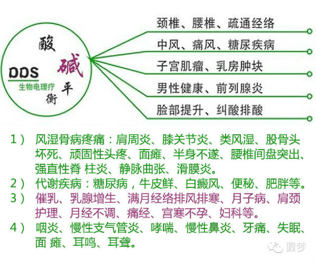 那神奇的DDS技术是什么呢?它是通过获得“中国国际专利与名牌博览会”金奖的酸碱平生物电美容养生按摩仪,把电源通过人体能量转换,作用于顾客,达到快速疏通经络,激活细胞,排酸,排排风,排寒,湿,排毒!从而达到细胞电位平衡,阴阳平衡,酸碱平衡!透皮给药,电解中和血液中的垃圾酸性物质,输入能量,使病变细胞带电正常,通过电位差,把获得国家专利,纯绿色植物提取的高科技世界首款纠酸中药成份,渗透到脏腑细胞!DDS技术,具有多种中医疗法的优势,综合了针灸、小针刀、推拿、按摩、刮痧、拔罐、点穴及各种电疗仪器的优势,疗效提高了许多倍,是一种纯绿色疗法,无任何毒副作用。也叫“无痛点滴”,“幸福疗法”!
