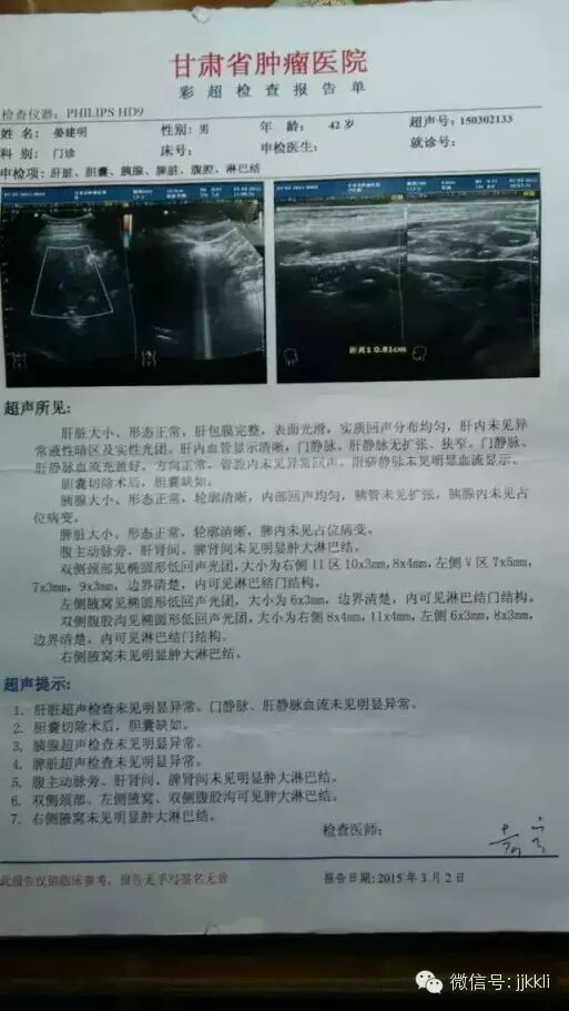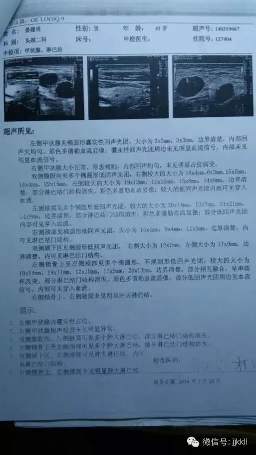 2014年3月份感觉自己爬楼有点喘,发现自己脖子下面有一串异物,还有吃饭总是感觉胃里面要打嗝,去医院检查,得了淋巴癌!淋巴遍布人体全身!检查后发现胃打嗝是因为肚子里有一个拳头大的恶性肿瘤顶住了他的胃。有检验报告为证。