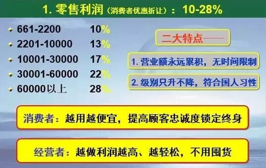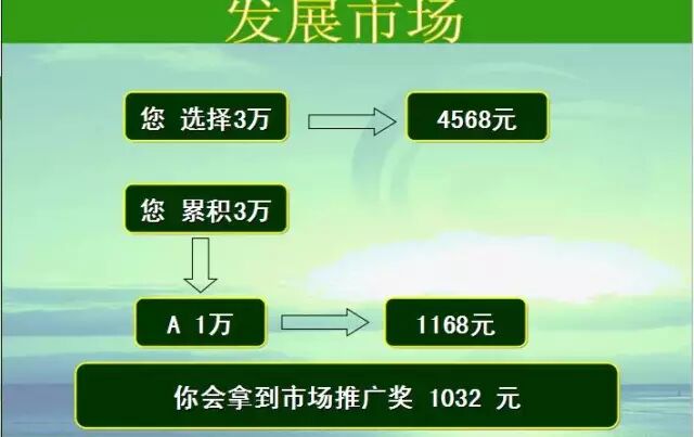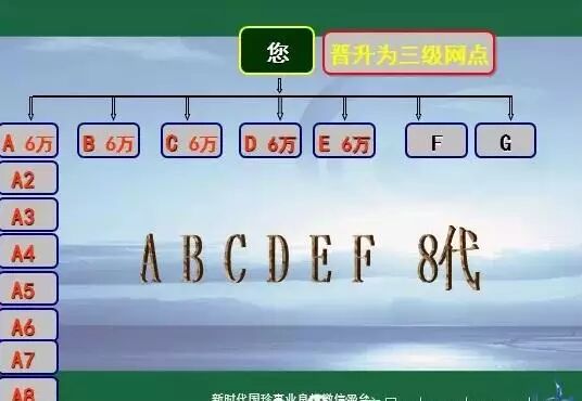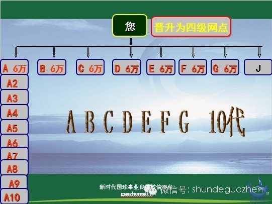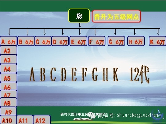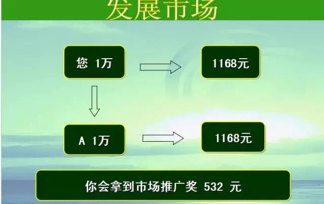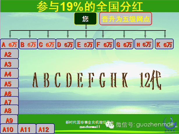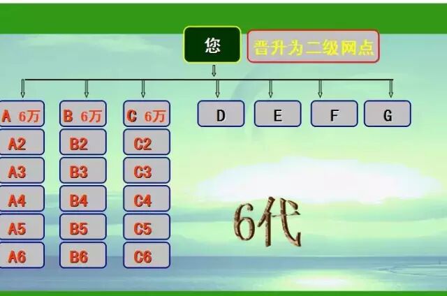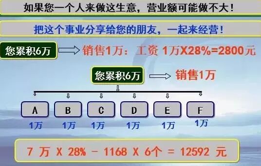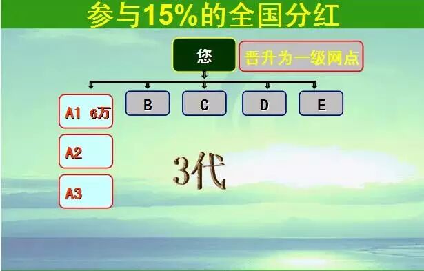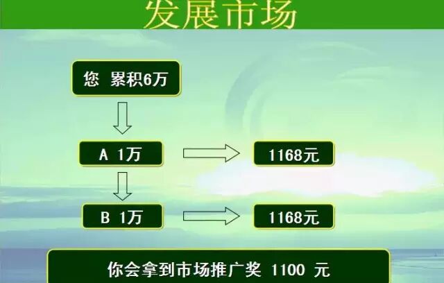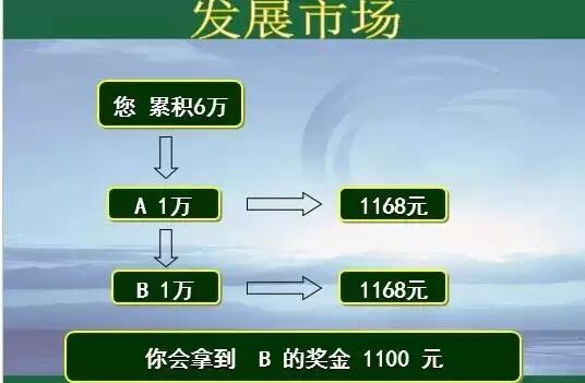 发展的团队销售:因为你开发A客户开发了B客户,B客户又开发了C客户,公司也会发给你的市场推广奖,以此类推,你可以拿到12代!