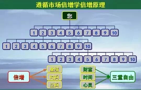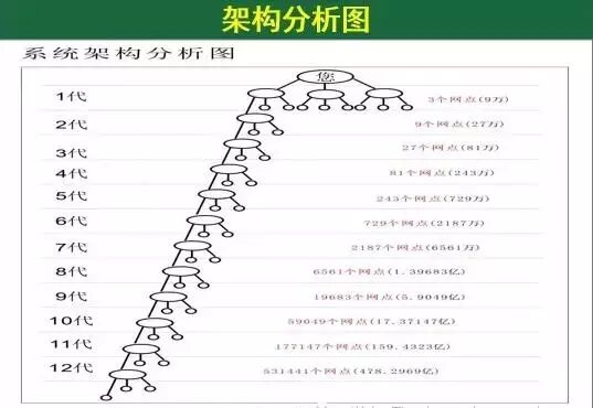 如果按照每个人开发3个网点,复制12代以后你将有531441个网点,每个网点给你带了1元/月的收入,你的月收入就是531441元,这就是倍增的魅力!