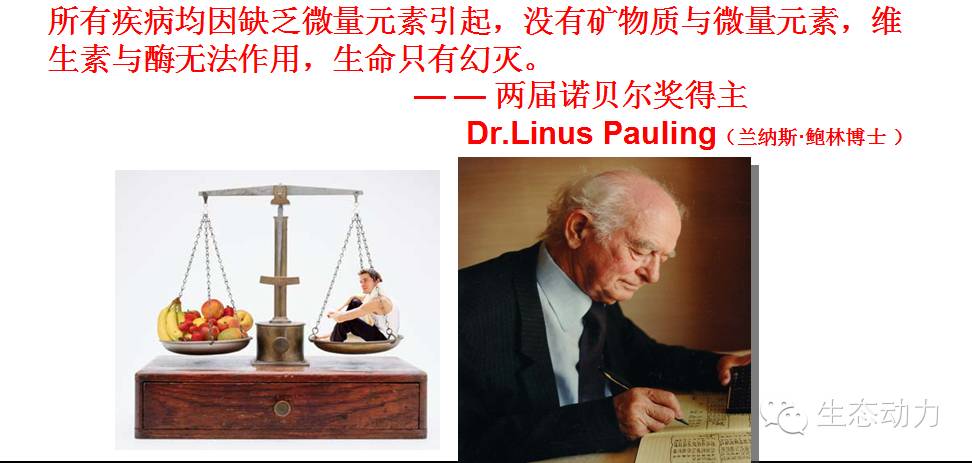 曾获1954年诺贝尔化学奖和1962年诺贝尔和平奖的美国加州理工学院著名化学教授,被国际科学界称为“20世纪科学怪杰”的兰纳斯. 鲍林博士早在50年代就论断: “人类所有疾病均源自矿物元素失衡!”。这一论点震惊了当时的国际医学界和元素营养学界,并由此推进了矿物元素全球研究热潮,使第五代原子级医学元素平衡医学得以诞生和发展。