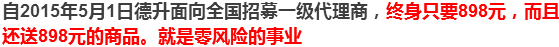 现在德升正面向全国招募一级代理商,终身只要898,后续没有任何一分钱的费用。利用连锁几何倍增3级分销模式运营。