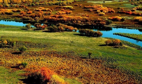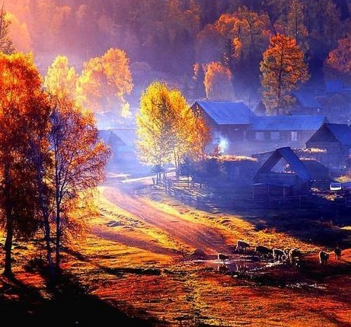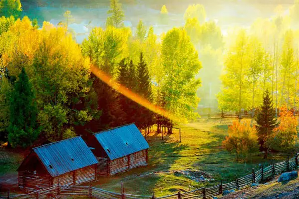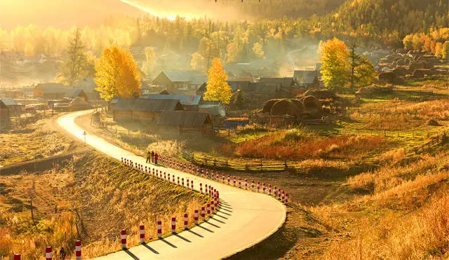 新疆哈巴河县铁热克提乡境内的白哈巴村,位于阿尔泰山的深山峡谷之中,四周森林密布,与哈萨克斯坦国只是一沟相隔,被称为“西北第一村”。村民住着朴素的尖顶木头房子,星罗棋布地分布在沟谷底,金黄色的桦树、杨树点缀其间,两条清澈的小河蜿蜒环村流过。秋季一到,山村是五彩的红、黄、绿、褐色,层林尽染,犹如一块调色板,加之映衬阿勒泰山的皑皑雪峰,一年四季都是一幅完美的油画。