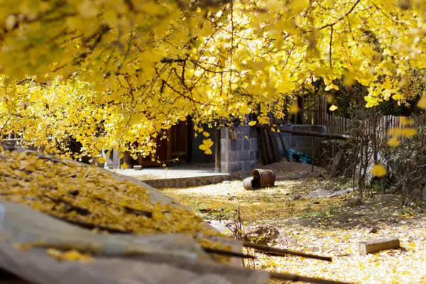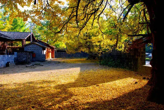 江东村银杏除具有古老和天然连片等特色外,还有一个最大的特点就是“村在林中,林在村中”,相互依托,浑然天成,它们的古老让这个小村庄更加显得古朴和深邃。微风吹过,黄叶在空中翻滚飘舞,随后又厚厚铺满房顶、屋头、小巷、田埂,钻进石头缝隙,落入房檐深处……游人身临其境,仿若走进金色的童话世界。