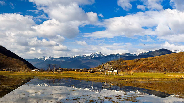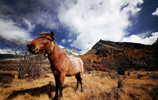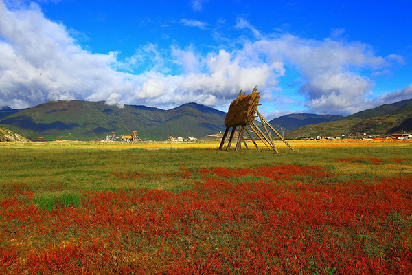 秋天,是云南香格里拉最精彩的瞬间,这里有典型的藏区高原风光,蓝天、白云、牛羊、雪山、草甸、牧场,再加上纯朴、骠悍的藏族人民,构成了一副明朗、和谐的自然生态。在第一阵秋风吹过之后,草原的颜色就开始悄悄地改变了,大棵大棵的酥油花、红黄相间的狼毒花、深紫的鸢尾花……草原上缀满的火红花海,它们红得那么惊心动魄,红得如此热烈赤诚,红在你眼中,也红入你心里。若你走进香格里拉的纳帕海,映入眼帘的是金色的草原、皑皑的雪山和充满灵性的各种鸟类。