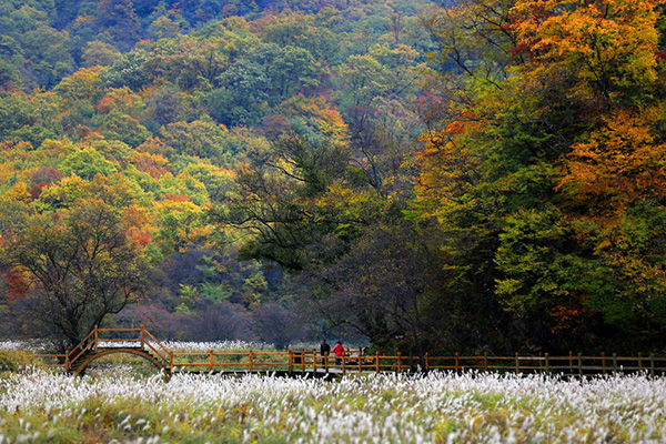红叶谷从庆岭镇的解放村,一直到松江镇的沿江村,全长50多公里。10月中旬的红叶谷五彩斑斓得一塌糊涂,林子中的叶子都脱去了绿意换上了新颜,红叶林、白桦林,红白相映,远观飞霞漫天,近赏如玛瑙般剔透玲珑。在林中穿行的人,拼接出一幅幅流动的画面。