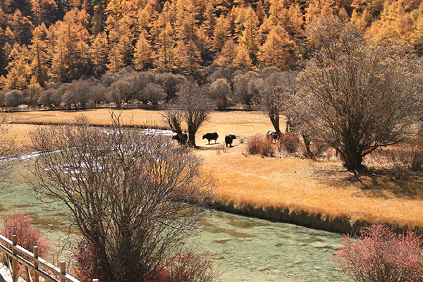 金秋是米亚罗的四季之最,10月是米亚罗的全年最美,3000多平方公里的山林,被点染上了十几种绚丽的色彩。秋风吹过,河谷两岸密林中的枫树、槭树、桦树、鹅掌松、落叶松等渐次经霜,树叶被染成绮丽的鲜红色和金黄色,蓝天白云、山川河流共同勾勒出一幅醉人画卷。