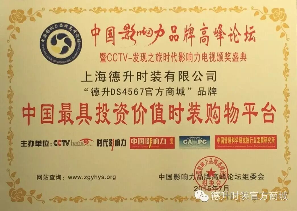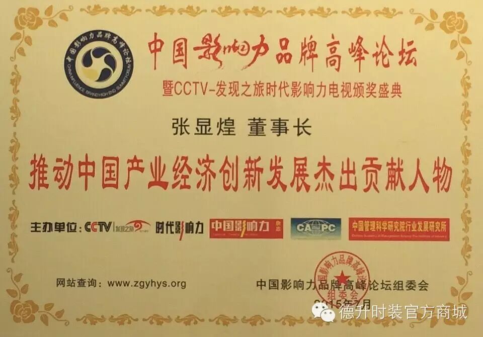 至今,德升时装移动平台在全国移动端 流量第一、销量第一、知名度和影响力第一。德升集团董事长 张显煌 被CCTV评为“推动中国产业经济创新发展杰出贡献人物”,德升商城 同时被评为“中国最具投资价值时装购物平台” !