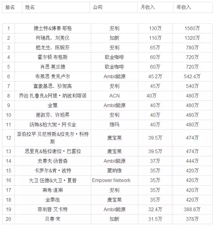 美国商业之家网站(BUSNESS FOR HOME)公布了2014年8月全球前150名直销行业顶级经销商名单,由于篇幅,我们截取了排名前20位的经销商收入榜(见下表)。