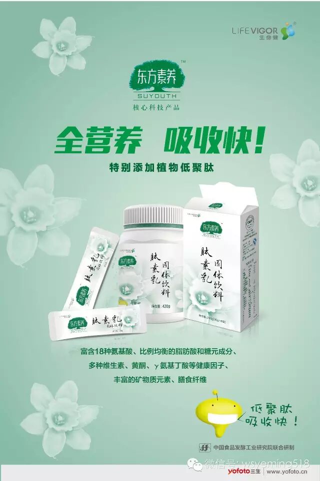 三生公司携手国内食品行业中历史最久、规模最大,专业配套齐全的综合性研究机构——中国食品发酵工业研究院,根据我国居民当前营养状况、体质差异和饮食习惯,共同开发一款能被人体快速吸收的全营养食品——东方素养肽素乳。产品富含比例完美的18种氨基酸,多种维生素健康因子、丰富的呈有机态的矿物质和微量元素,以及均衡合理的脂肪酸和糖元成分,是名副其实的全营养食品。
