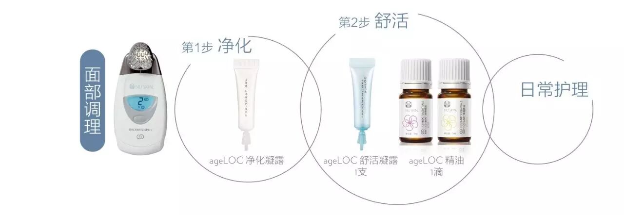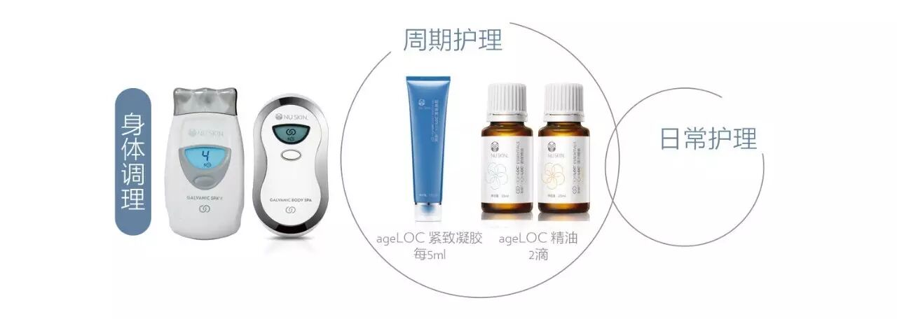 有「美容大王」之称的大S 就曾透露自己喜欢在家研究和自制各种美容产品。她还在节目中分享过姐妹淘们在家一边聚会,一边集体护肤的场景。每次在外拍戏,大S 也带着各类homemade 护肤品(homemade 此处意为在家自制/搭配使用不同产品),不放过任何保养的机会。 眼下,这股风潮大有越烧越火的趋势,DIY 式的美容受到越来越多人的欢迎。最爱护肤且紧跟潮流的达人们已经把热情转到homemade 护肤产品上来。如果有产品既能达到和美容院一样的目的,又能摆脱来回美容院的奔波,操作便利不受地域限制,让你随时随地、随心所欲地护理肌肤,这样的高效、便捷谁会拒绝呢? 懂你的 NU SKIN 早已准备就绪,下面三款ageLOC「神器」,将为你带来前所未有的尊享护肤体验,有了他们在家就能轻松做Spa。 10分钟*见证肌因美丽未来! (*10分钟为ageLOC™修身美颜Spa机的使用时间) 这个看脸的时代,如何才能获得一张人人羡慕的V脸呢?使用ageLOC™修身美颜Spa机,在家就能打造人见人爱的V字脸。 ageLOC™修身美颜Spa机运用先进的科技设计而成,可自行调节微电流,并可随时更换适用于脸部、头皮、身体等部位的按摩组件;搭配特别配方的保养品,让你在家体验Spa的多重功效,轻松享受脸部活力保养、雕塑美好身段的过程。 重塑窈窕体型 时间的流逝,让身体的肌肤变得松弛、下垂、失去柔润。精致的女人,除了追逐V字脸,连身体也要一起「V」,ageLOC™美体系列产品助你一臂之力。 ageLOC™美体系列产品蕴含ageLOC科技,ageLOC科技帮助你直击老化根源,重塑窈窕体型,让你在家也可尽享紧致青春的秘密。 肌因之美,油然绽放 NU SKIN 科学家发现,来自植物的天然菁萃,对基因表达有着显著的影响力。 这一款ageLOC科技加持的精油可为你带来全新的护肤体验。 与市面上已有的精油不同,ageLOC 精油开启科技芳疗新世代,创新ageLOC 科技结合6S 品质措施,严选珍稀植萃,反复尝试各种配比,严控制作工艺,直击老化根源。NU SKIN 通过大量实验观察不同精油对基因表达的影响,从而研发出可以很好改善肌肤状态,延缓衰老的科学组方精油。 此次ageLOC 精油共推出玫瑰、茉莉、舒缓和活力四款复方精油,能够满足你的不同需求。有了如此优异的产品,再配合前面提到的专业Spa机,轻松为你打造精彩V人生。下面的搭配方法告诉你,如何配合使用,才能达到最佳效果。 ageLOC 玫瑰精油和ageLOC 茉莉精油是针对脸部肌肤设计的精油,滴滴精粹,为避免浓度太高造成肌肤不适,请一定用ageLOC 精护油及ageLOC 舒活凝露稀释后再进行使用。未经稀释的ageLOC 精油不能直接使用。 脸部抗衰老全新体验 精油日护理 将2滴ageLOC 玫瑰/茉莉精油与5ml ageLOC精护油混于精油调香瓶内,作为一个单独的护肤步骤,于其他精华液之后取适量涂抹于全脸。 ageLOC 活力精油和舒缓精油,ageLOC 玫瑰精油和茉莉精油都可用于身体肌肤的护理;同样,也请用ageLOC 精护油及ageLOC 紧致凝胶稀释后再进行使用。 紧致青春 跃然绽现 将ageLOC 紧致凝胶与ageLOC 精油以每5ml 凝胶加2滴精油的比例进行稀释调配,混合均匀后涂抹于身体肌肤,再使用美体Spa 机以适当的力道进行按摩。 现在你还觉得美容院是必去不可的吗? NU SKIN ageLOC系列产品 拥有ageLOC专业的科技加持, 为伙伴带来舒适便捷的尊享体验,