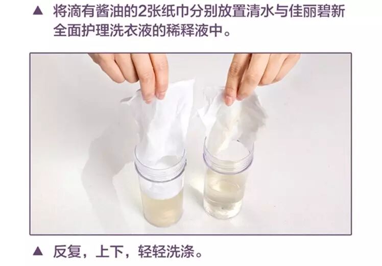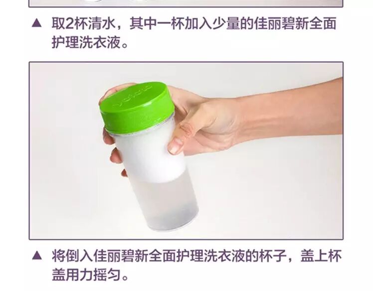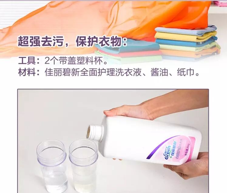 洗衣领袖口:取适量佳丽碧新全面护理洗衣液涂于衣领袖口处,数分钟后机洗或手洗