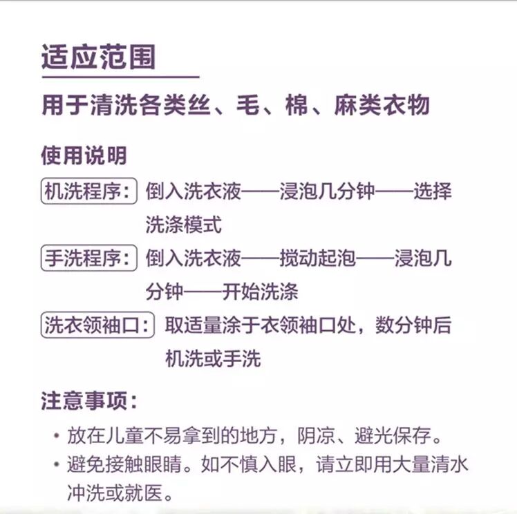 专业配方,性质温和,可清洗各类化纤、丝、毛、棉、麻类衣物