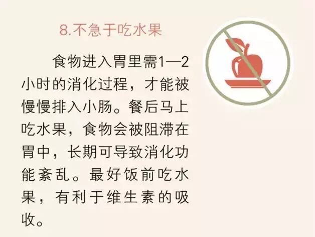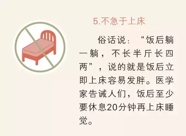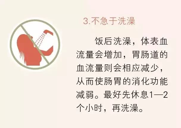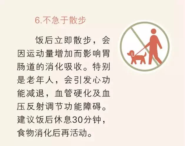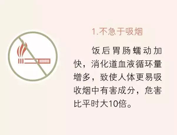 ①不急于吸烟;②不急于饮茶;③不急于洗澡;④不急于松裤带;⑤不急于睡觉;⑥不急于散步;⑦不急于开车;⑧不急于吃水果;⑨不急于刷牙。这9个健康雷区你踩中了吗?从今天起给你的“饭后养生”立个规矩,饭后不要急着做这9件事!
