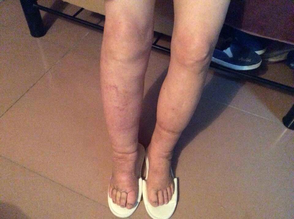 第二次火疗过程中女士感觉脚背脚底疼痛难忍!到了晚上脚底开始排毒水。 大家看看地上的布湿过好几条!
