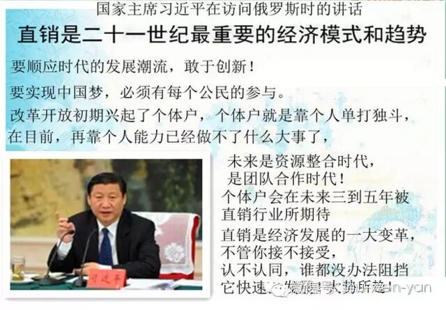 中国的直销市场大有山雨欲来 风满楼之势,各个直销企业都在摩拳擦掌,因为在2015年,中国的直销将全面开放。在十二五规划中,国家发改委已经正式宣布,要把营养与保健纳入未来重点发展的产业,到2015年,中国的保健品市场将达到10000亿元……。习近平主席访俄罗斯的讲话:直销是经济发展的一大变革,不管你接不接受,认不认同,谁都没办法阻挡它快速的发展!”正式明确了直销在中国经济的地位。直销经历了20来年,我感觉今天才是中国直销业的春天,终于从被很多人不认可的灰色地带进入到阳光世界。就像当年的个体户被中央领导人认可一样。当年的个体户你没看起,这个机会错过永不会再来(低投资高利润期);今天类似的机会又摆在你的面前,你还因为看不懂而错过吗? 所以当你觉得直销还是趋势的时候,已经比别人慢了一拍, 因为,这已经不是趋势而是现实,只是你还没有认真分析而已……新一轮财富浪潮机遇已经来临你是否能够把握?