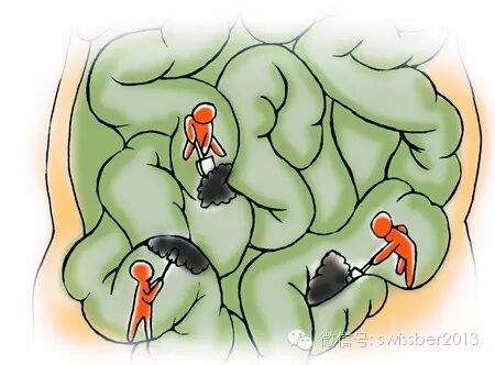 它们在细菌的作用下干结、腐败、发酵,日积月累,这些食物残渣最终形成厚达5-7毫米,重达5-6公斤的黑色、恶臭、有毒的物质,并像锈一样牢牢地粘连在肠壁上,其坚硬程度与轮胎相似,它们慢慢侵蚀着我们的身体,人们习惯称之为宿便。