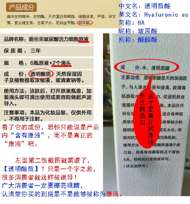 甚至我在某产品成份说明上看见过更好笑的东西,它的成份内有:玻尿酸,然后是某某保湿济之内的,最后有一样是透明质酸,我就好奇了,玻尿酸不就是透明质酸吗?你的成份里又是玻尿酸,又是透明质酸的?这生产厂家到底懂不懂什么是玻尿酸?你这瓶玻尿酸里真的含有玻尿酸吗???
