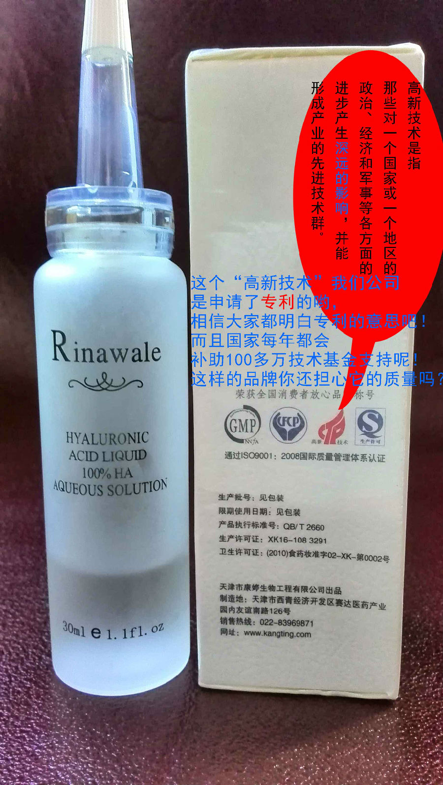 现市面上销售的所谓“玻尿酸原液”只要产品里稍微添加点玻尿酸,就打着“玻尿酸原液”的招牌,还理直气壮的告诉你:“我们这个是高纯度原液,无添加”让消费者眼花缭乱,无从辨别。